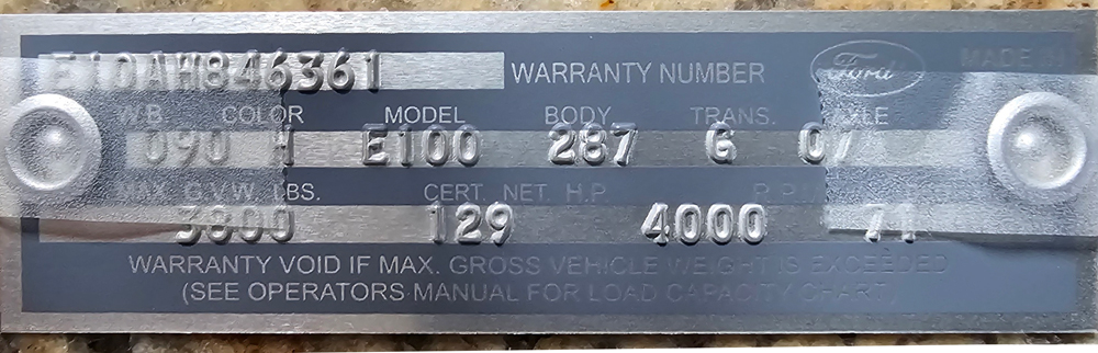 Here is the Warranty plate data from a specific Ford Econoline